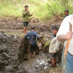 The villagers have been busy clearing a pathway for construction of the headworks and pipeline for the new water pipe. Two toilet rings plus lid, which will serve as the headworks reservoir, have been hauled to site using tractors. A quantity of sand and gravel has also been taken to provide on-site concrete where needed. The enthusiasm of the village women to participate in this project is great to see. Some progress has been made with headworks under way with the help of the local villagers.